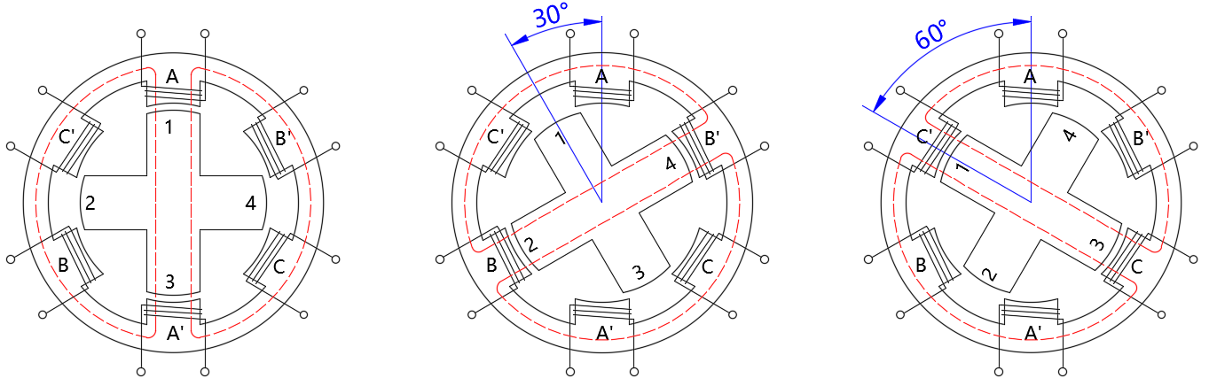 19、对于如下图所示的三相步进电机,当采用三相双三拍通电方式时,其步距角是?( )