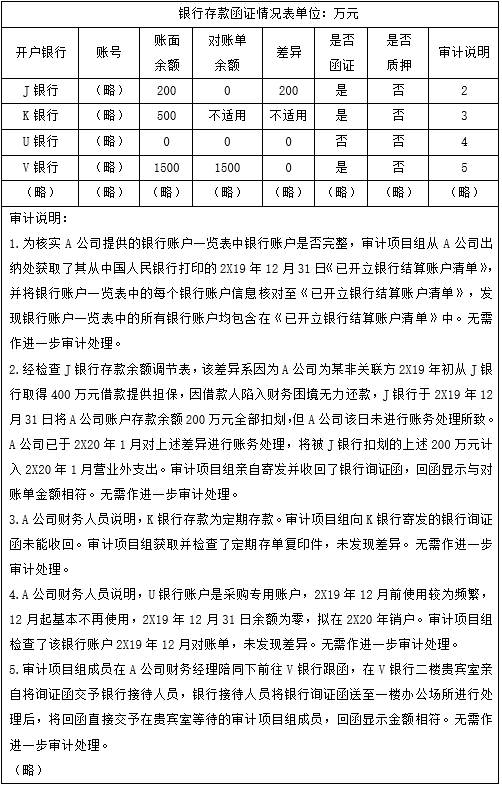 2.审计项目组对A公司2X19年12月31日银行存款余额实施了实质性程序,相关审计工作底稿部分内容摘录如下: