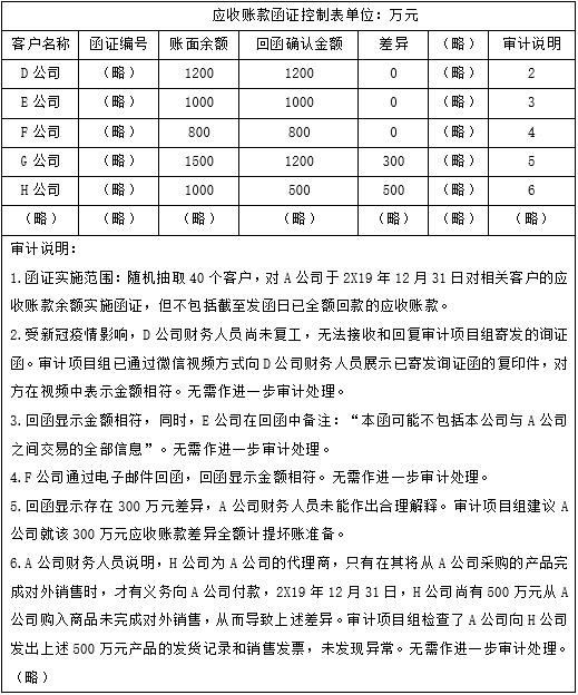 1.审计项目组对A公司2X19年12月31日应收账款余额实施了函证程序,相关审计工作底稿部分内容摘录如下: