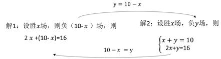 例题:篮球联赛中,每场都要分出胜负,每队胜1场得2分,负1场得1分。某队10场比赛中,得到16分,那么这个队胜负场数分别是多少?