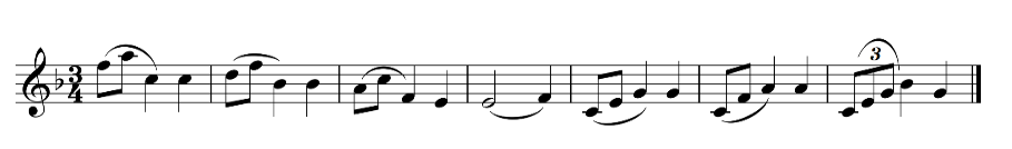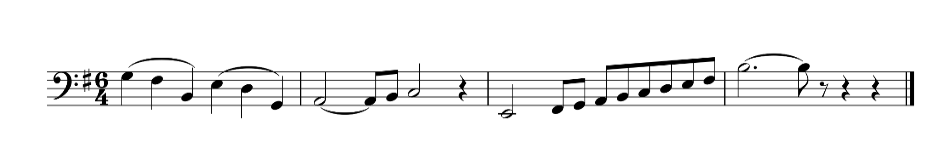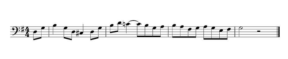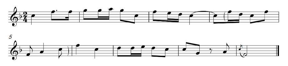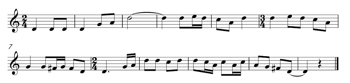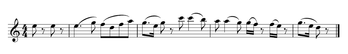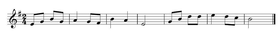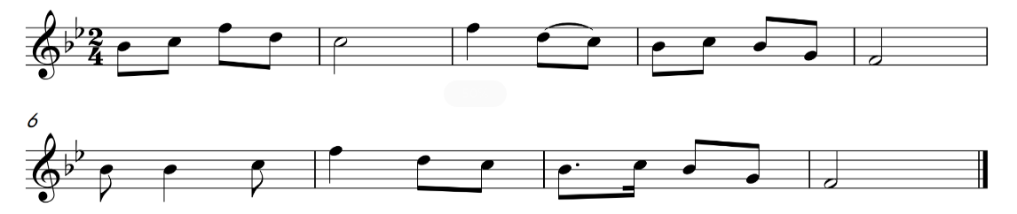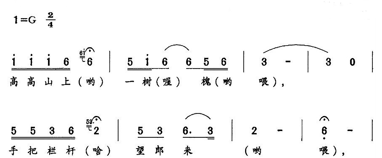 该谱例主要的发展手法是重复,共四个分句,第二句和第四句是第一句的变化重复,第三句是第一句的完全重复。