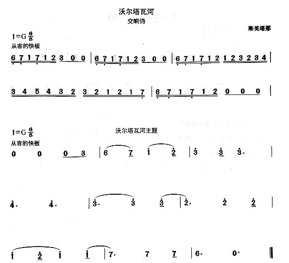 《沃尔塔瓦河》选自交响套曲《我的祖国》,作者斯美塔那,是捷克作曲家,钢琴家和指挥家,捷克古典音乐的奠基人。捷克民族歌剧的开路先锋,捷克民族乐派的创始人。1874年不幸耳聋,继续坚持创作,其中最著名的有由六部独立交响诗组成的交响诗套曲《我的祖国》和第一弦乐四重奏《我的生活》。被誉为“捷克民族音乐的奠基人”“新音乐之父”“捷克的格林卡”。