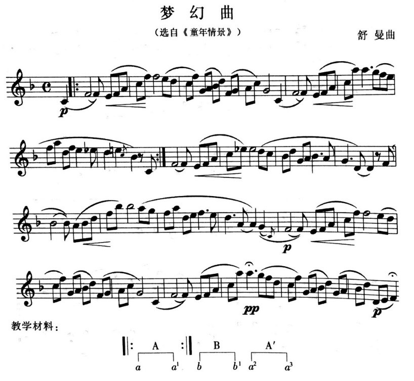 【知识与技能】了解《梦幻曲》的乐曲A-B-A'的带再现的单三部曲式结构,并能跟音乐哼唱乐曲主题旋律。