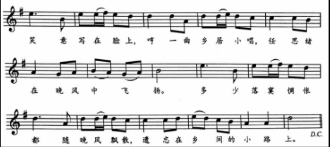 上面谱例中前一句旋律的结束音和下一句旋律的第一个音相同,这种创作手法叫作鱼咬尾,也叫衔尾式、接龙式,是中国传统音乐的一种结构形式。