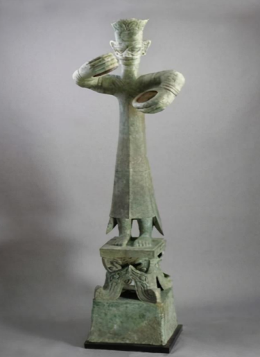 题干中《青铜立人像》是目前中国出土的年代最久远、最高大的青铜人像,头戴莲花冠(象征太阳),冠上饰有变形兽面,有着环管状的巨手,在当时代表的是具有巫术力量的领袖人物,该雕像出土于四川广汉三星堆。故本题选A。