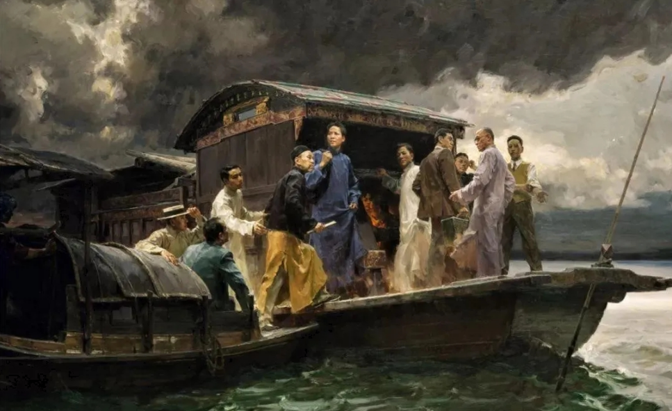 本题考查的《启航——中共一大会议》是何红舟、黄发祥合作,于2009年完成的作品,现藏于中国美术馆。作品描绘的是十余位中国共产党早期代表登上浙江嘉兴南湖的一艘船的画面,中共一大最后一天的会议就在这艘画舫上开始了。何红舟、黄发祥在进行创作前进行了多种构思,最后选定以最后一次会议为主题。这是因为在历史上,原定会址是其中一名成员家中,但却在会议前夕的讨论会上,有疑似暗探的人员进入会场,代表们立刻停止讨论会并离开现场,果然代表们离场不久,法租界巡捕房的警车就到了。代表们不得不因此陆续转移到浙江嘉兴,于是,中共一大的最后一天会议便在浙江嘉兴南湖的一艘游船上召开。故本题选C。