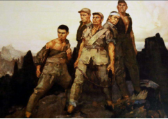本题考查近现代重要的美术家詹建俊的作品。《狼牙山五壮士》为詹建俊的代表作品,创作于1959年,该画作描绘的是抗日战争时期五位八路军战士在寡不敌众的形势下,据险抵抗,直至弹尽援绝,毅然砸枪跳崖的英勇场面。