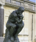 本题考查雕塑大师罗丹。罗丹,19世纪法国最伟大的雕塑家,代表作品有《思想者》、《加莱义民》、《青铜时代》、《手》、《雨果》、《吻》、《巴尔扎克》等,图中代表作品是《思想者》。