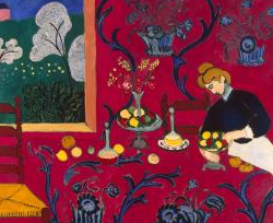 本题考查艺术流派。《红色的和谐》是法国画家马蒂斯于1908年创作的油画,现藏于俄罗斯圣彼得堡艾尔米塔日博物馆。这幅画表现的是一位妇女在餐桌前忙碌的情形,餐桌上放着水果,瓶中所盛的可能是甜酒,藤蔓植物花纹均匀地分布在墙面和桌面上。