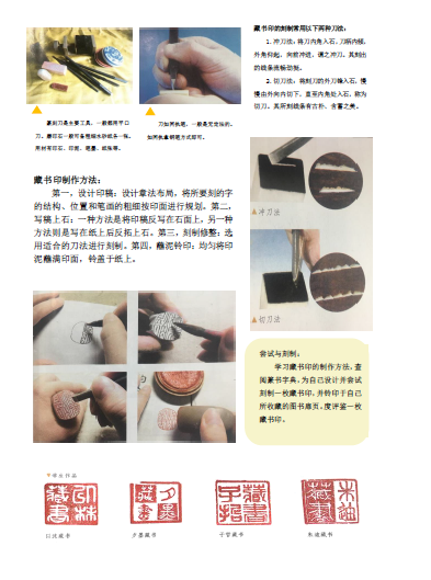 知识与技能:了解藏书印艺术的起源和发展,所用材料和工具,用途及分类以及布局和意法。