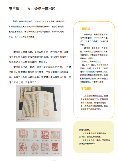 教学重点:学生能够了解藏书印的相关知识,并掌握篆刻的基本刀法。