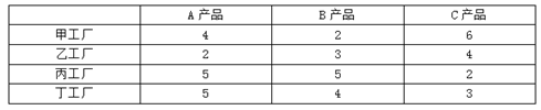 甲、乙、丙、丁四个工厂均能生产A、B、C三种产品,不同工厂生产每种产品的最高日产量如下表所示(已知每个工厂每天只能生产同一种产品):
